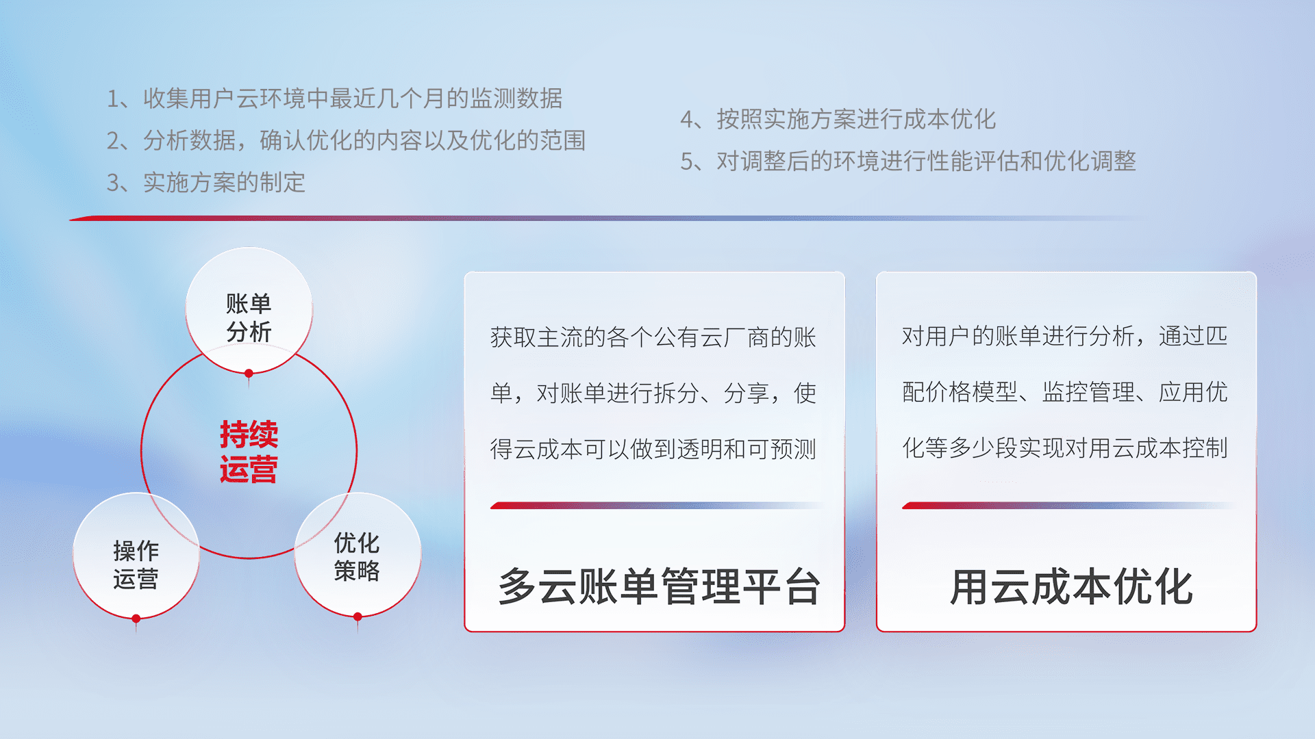 通过多云纳管,,,,以统一的资源数据模型把客户的云资源进行抽象和封装,,,进而实现对多云资源的统一操作,,,,保障云资源管理的可靠性、、、稳定性与可用性。。。。量身定制化运维内容,,配置、、、、开发运维、、、、补丁管理、、、备份、、、、监控、、认证和访问管理、、审计和日常巡检等,,,保障在用云过程中的可靠度,,稳定度以及高可用率。。